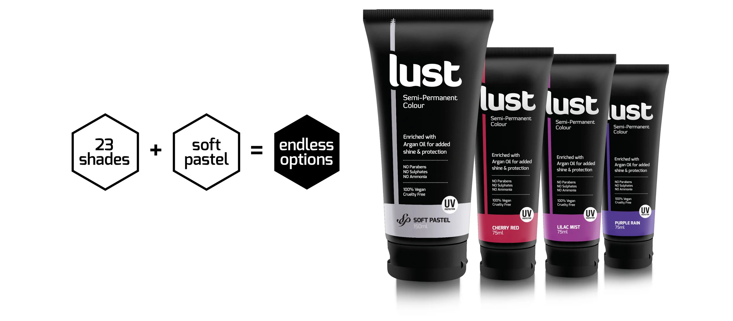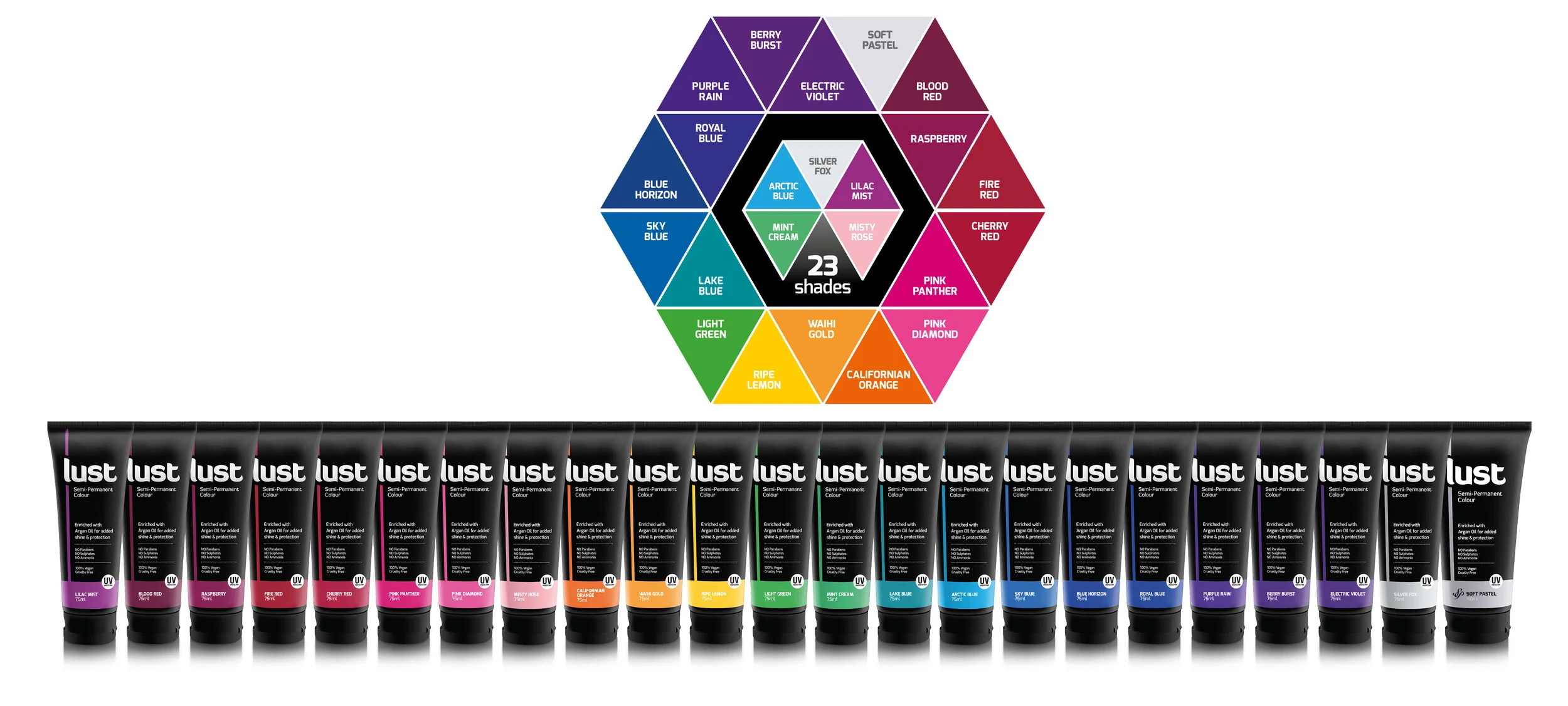 23 shades designed to be used on their own or intermixed to create an endless colour palette. Create bold intense shades, bright fluros or shimmering pastels, the only limitation is your imagination. Lust offers strong vibrant fashion shades that can be softened into pastel tones by mixing the 150ml tube of the Soft Pastel shade.